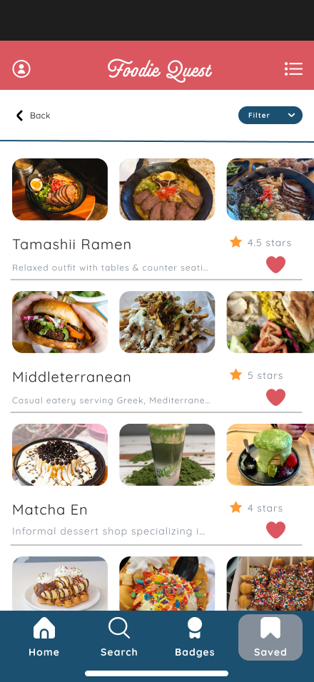 Quest and reward pages: Tracking progress, unlocking badges, and highlighting rewards. These rewards could include discounts at restaurants users have visited or similar places, incentivizing exploration and making the “quest” experience more meaningful.