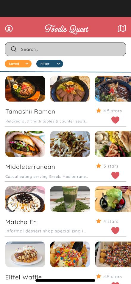 At this stage, the app prototype is about finalizing details and smoothing out interactions, turning the foundational wireframes into an interactive, visually engaging experience. Each component, from the pop of color to the authentic restaurant photos, is designed to create an approachable, fun, and user-focused app that encourages exploration and celebrates real food experiences.